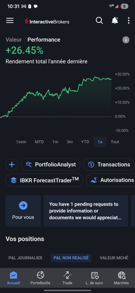 Interactive Brokers propose deux interfaces principales : la Trader Workstation (TWS) pour desktop, et l’application mobile. Pour un usage quotidien, j’utilise exclusivement le mobile.