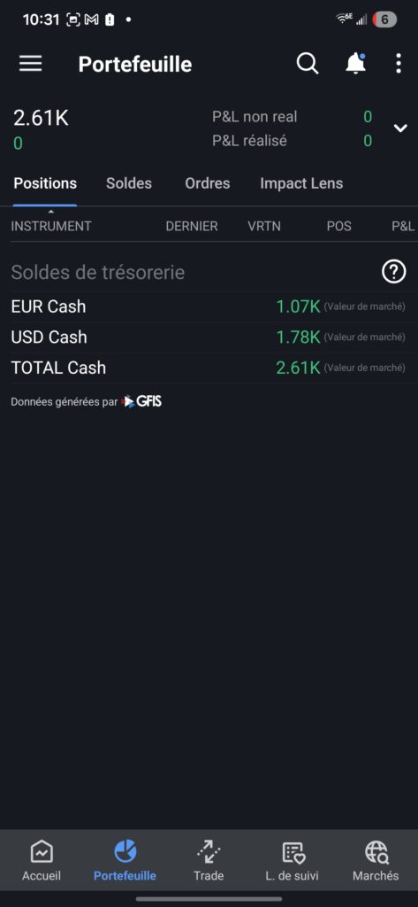 Un point notable : IBKR gère nativement le multi-devises. Si vous investissez en actions américaines (en dollars) et en actions européennes (en euros), vous voyez vos soldes séparément par devise. C’est un niveau de granularité qu’on ne trouve pas chez les courtiers plus simples.