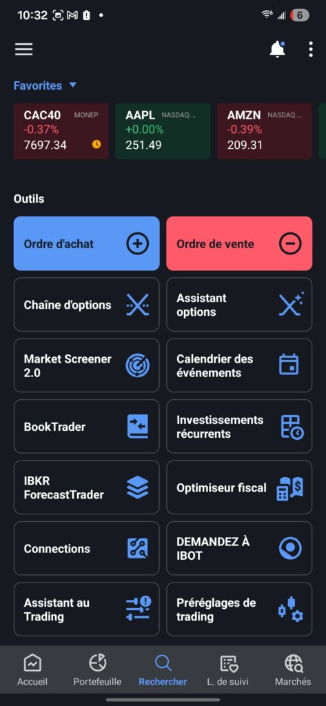 Ce qui frappe en ouvrant l’appli pour la première fois : la densité d’outils disponibles. Depuis l’onglet Trade, on accède à la chaîne d’options, l’assistant options, le Market Screener, le calendrier des événements, le BookTrader, les investissements récurrents, l’optimiseur fiscal, le ForecastTrader… C’est un terminal de trading complet dans la poche.