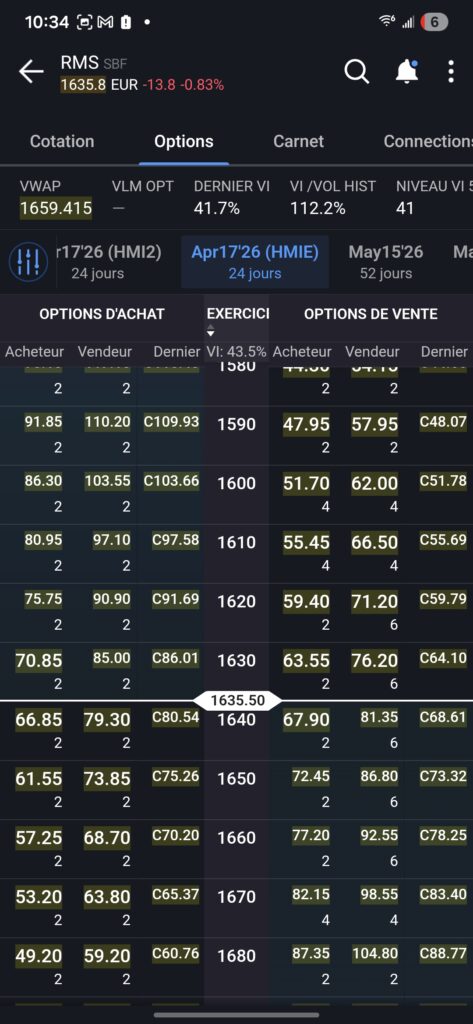 Sur l’exemple de la chaîne d’options Hermès (RMS) à 1 635€ : on voit les options d’achat (calls) à gauche et les options de vente (puts) à droite, pour chaque strike (prix d’exercice) de 1580 à 1680€. L’expiration sélectionnée est avril 2026 (dans 24 jours au moment du screenshot). La volatilité implicite est de 41,7% – un niveau qui reflète l’incertitude du marché sur le titre.