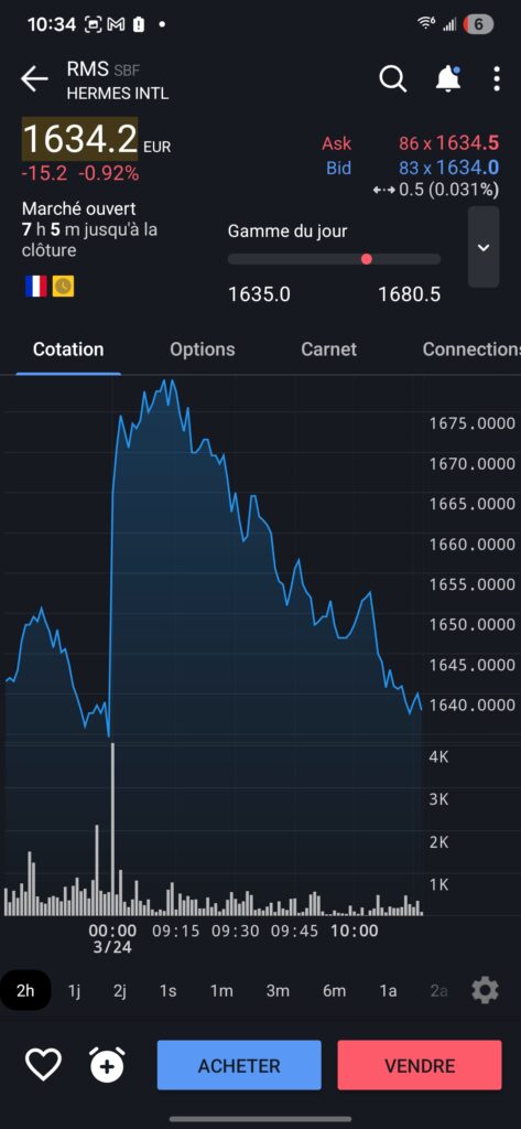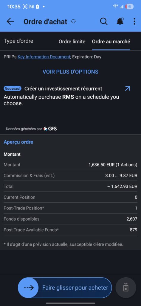 En pratique : sur mon ordre d’achat d’1 action Hermès (1 636,50€), la commission estimée était de 3,00 à 9,87€ selon les frais de bourse externes inclus. Le total estimé ressortait à environ 1 642,93€. C’est transparent – vous voyez exactement ce que vous payez avant de confirmer.