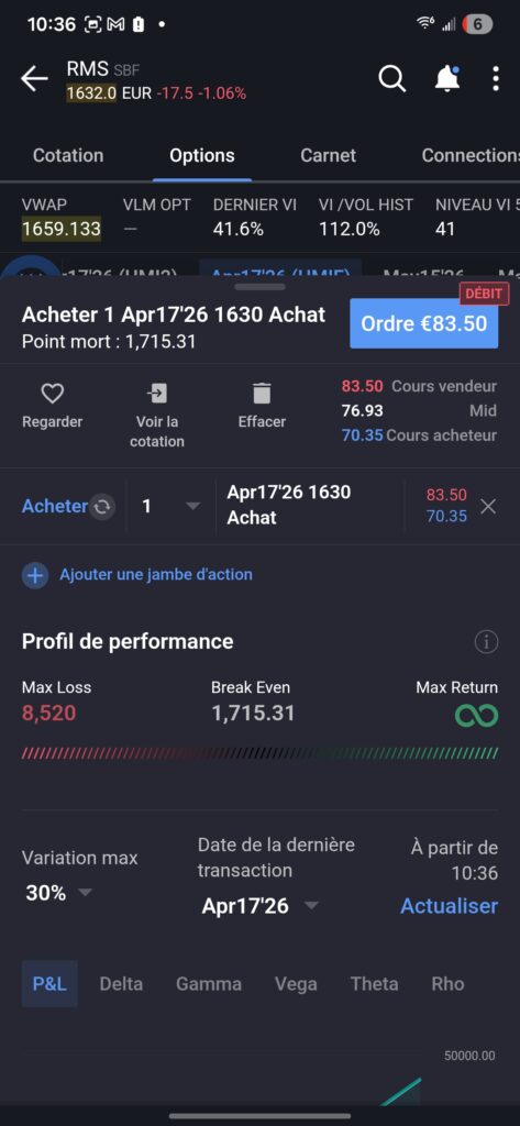 L’interface de passage d’ordre sur options est particulièrement bien conçue. Pour un achat de 1 call Hermès strike 1630 expiration avril 2026 : le premium demandé est de 83,50€, le cours mid est à 76,93€, le cours acheteur à 70,35€. IBKR affiche immédiatement le profil de performance de la position : Max Loss 8 520€ (perte limitée au premium × 100), Break Even à 1 715,31€ (prix auquel le sous-jacent doit atteindre pour être rentable), Max Return illimité à la hausse. Les grecques (Delta, Gamma, Vega, Theta, Rho) sont accessibles en un clic.
