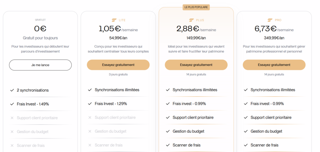| Lite | 54,99€/an (1,05€/semaine) | Illimitées | + Synchronisations illimitées, dividendes, budget, scanner de frais, rebalancement avancé |