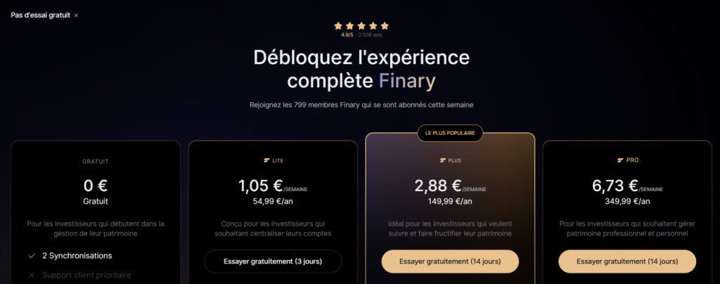 Sur le prix, les deux se valent à peu près. Finary Lite à 54,99 euros/an, Snowball Investor à environ 140 euros/an. Finary est moins cher pour l’entrée de gamme. Snowball revient plus cher pour accéder à ses fonctionnalités avancées, mais ces fonctionnalités avancées n’ont pas vraiment d’équivalent ailleurs.