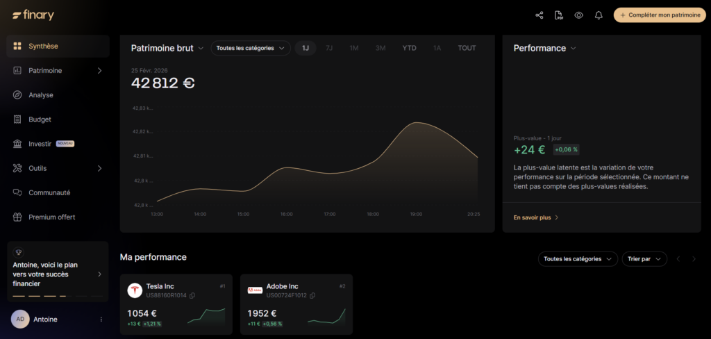 C’est l’atout principal de Finary. En quelques clics, j’ai une synthèse complète : actions, ETF, cash, commodités, or physique ajouté manuellement. Le graphique d’évolution du patrimoine brut est clair, avec des filtres temporels (1 jour, 1 semaine, 1 mois, 1 an, tout) pour zoomer sur la période qui vous intéresse.