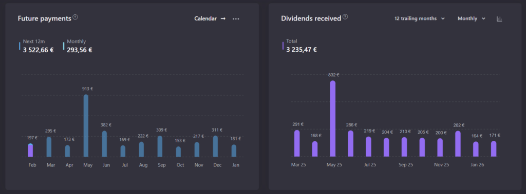Mon portefeuille affiche 3 235 euros de dividendes reçus sur les 12 derniers mois et 3 522 euros estimés sur les 12 prochains, soit environ 293 euros par mois en moyenne. Ce niveau de projection change la façon dont on pense à son portefeuille : vous ne voyez plus seulement une performance en pourcentage, vous voyez un revenu concret.