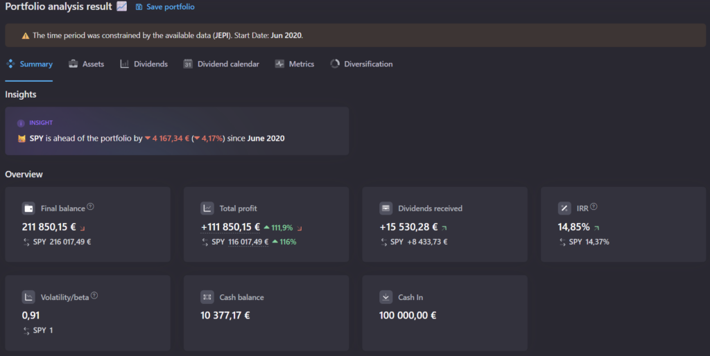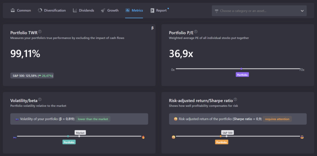 Interface comprise en moins d’une minute. Les onglets (Common, Diversification, Dividends, Growth, Metrics, Report) couvrent tout ce dont un investisseur actif a besoin au quotidien. À noter : l’interface est intégralement en anglais, ce qui peut dérouter certains utilisateurs francophones même si la terminologie financière reste accessible.