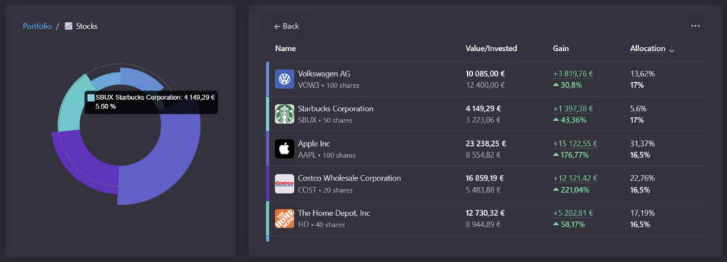 Le P/E pondéré du portefeuille entier. D’un seul coup d’oeil, vous voyez si votre portefeuille global est valorisé chèrement ou raisonnablement. Mon portefeuille ressort à 36,9x, ce qui me situe clairement par rapport au marché.