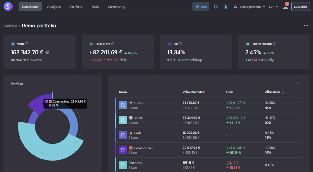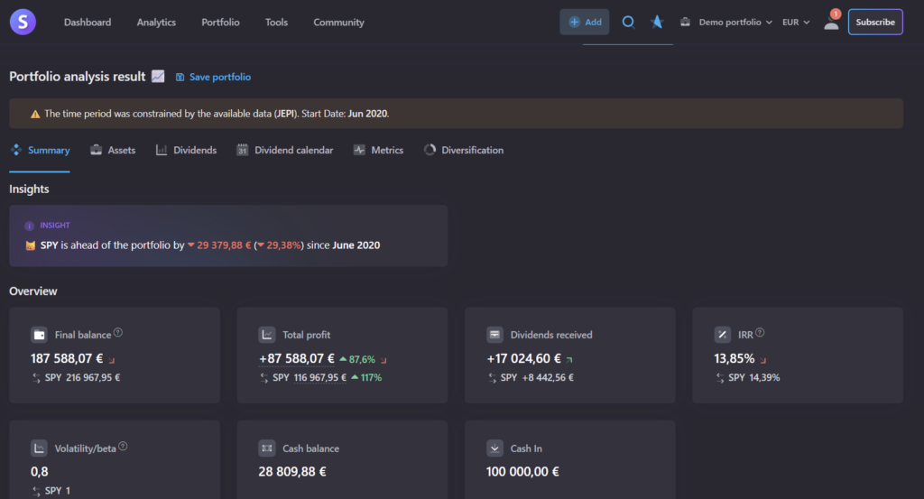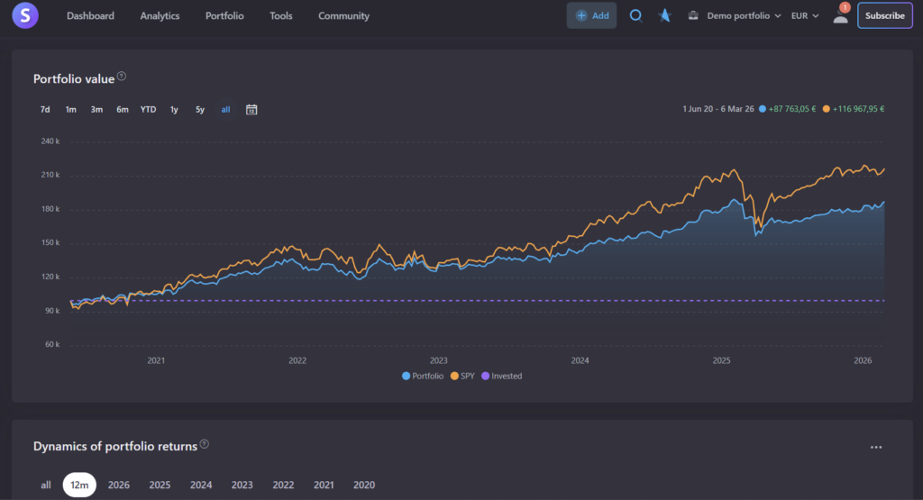 Vous voulez des métriques sérieuses sur votre portefeuille boursier – TWR, bêta, Sharpe, backtesting, dividend rating. Votre courtier est compatible avec Snowball. Vous investissez activement et voulez vraiment comprendre votre performance réelle.
