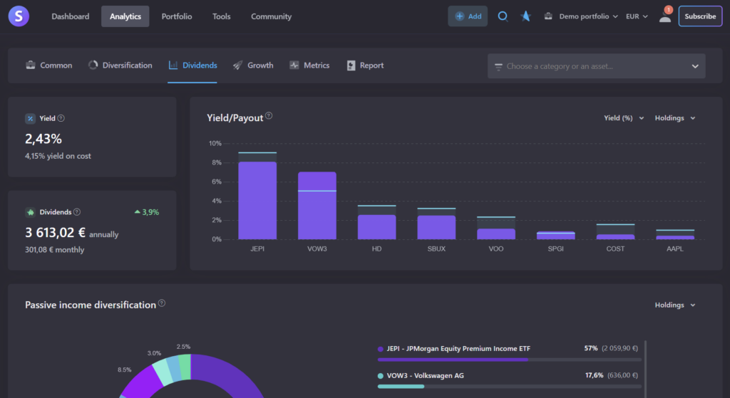 L’onglet Dividendes affiche le yield actuel, les dividendes annuels projetés, le graphique Yield/Payout par action, et la répartition du revenu passif entre les lignes du portefeuille. Sur le portfolio démo : 3 613€/an soit 301€/mois.