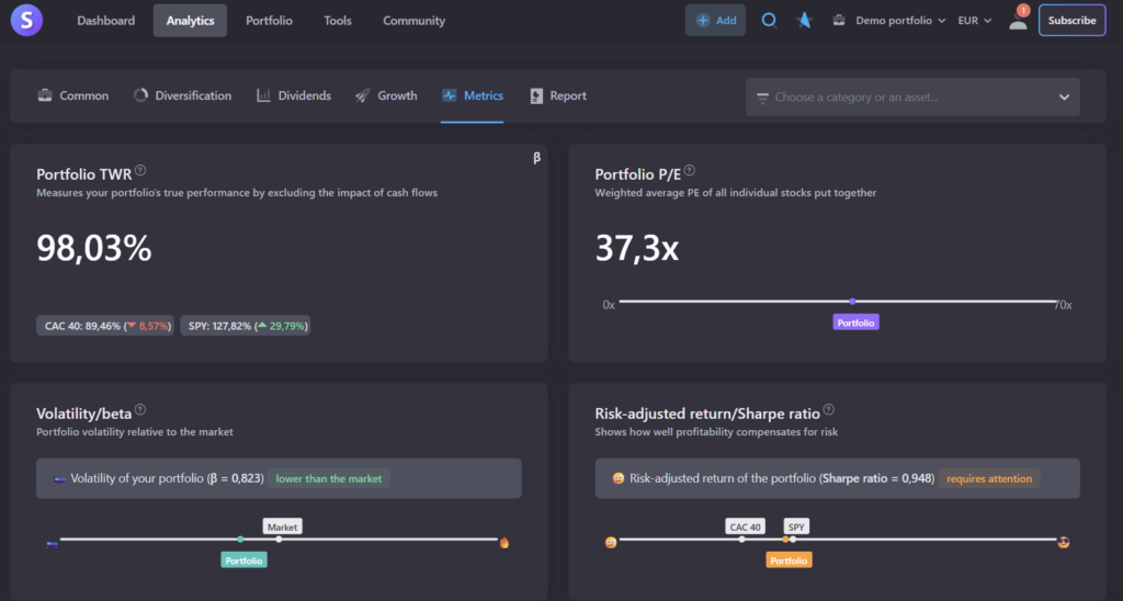 C’est là que Snowball se distingue de tous les outils gratuits du marché. Sur le portfolio démo : TWR 98,03%, P/E pondéré 37,3x, bêta 0,823 (moins volatile que le marché), Sharpe ratio 0,948, Sortino ratio 1,674.