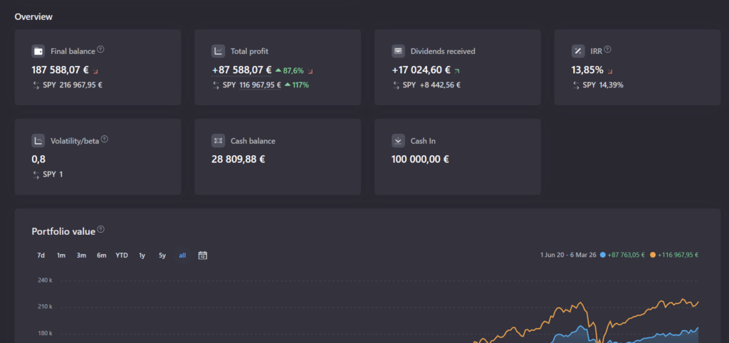 Sur l’exemple du portfolio démo : 100 000€ investis en février 2013 auraient donné 187 588€ (+87,6%) avec 17 024€ de dividendes reçus et un IRR de 13,85%. Le SPY aurait donné +117% sur la même période. Une information décisive pour évaluer une stratégie avant de l’appliquer réellement.